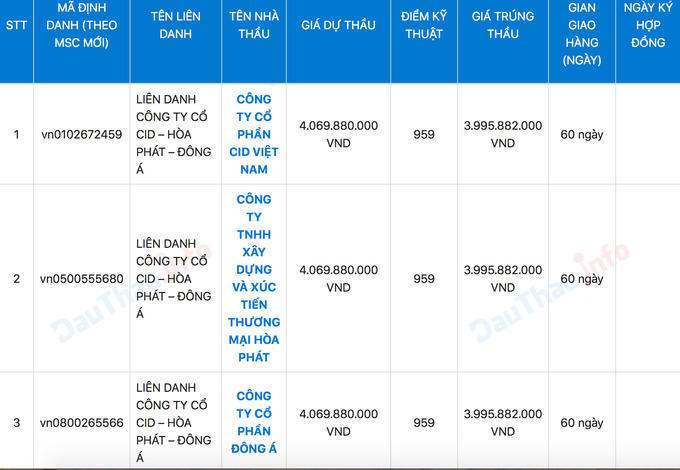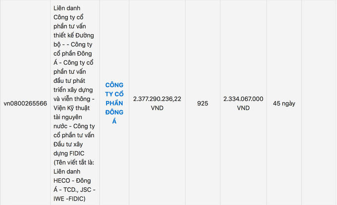 Cụ thể, ngày 14/8/2024, ông Vũ Văn Tùng - Giám đốc Ban Quản lý Dự án Đầu tư Xây dựng (QLDA ĐTXD) tỉnh Hải Dương ký Quyết định phê duyệt kết quả lựa chọn nhà thầu gói thầu số 01: Tư vấn khảo sát xây dựng, lập Báo cáo nghiên cứu khả thi, thuộc dự án Xây dựng 03 Trường Trung học phổ thông tỉnh Hải Dương. Công ty Cổ phần Đông Á nằm trong liên danh trúng thầu với giá 658.320.000 VND (giá gói thầu là 679.540.000 VND), tiết kiệm cho ngân sách 21,2 triệu đồng, tỷ lệ tiết kiệm 3,1%.