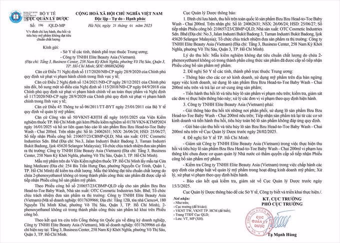 Cục Quản lý Dược (Bộ Y tế) yêu cầu: Đình chỉ lưu hành, thu hồi trên toàn quốc lô sản phẩm Bzu Bzu Head-to-Toe Baby Wash - Chai 200ml. Trên nhãn ghi: Số lô: 24062631; NSX: 26.6.24; HSD: 25.6.27; Số tiếp nhận Phiếu công bố: 210657/23/CBMP-QLD; Nhà sản xuất: OTC Cosmetic Industries Sdn. Bhd (Địa chỉ: No.3, Jalan Industri Bukit Badong 3, Taman Industri Bukit Badong, Ijok 45620 Selangor Malaysia); Tổ chức chịu trách nhiệm đưa sản phẩm ra thị trường: Công ty TNHH Elite Beauty Asia (Vietnam) (Địa chỉ: Tầng 3, Business Center, 258 Nam Kỳ Khởi Nghĩa, phường Võ Thị Sáu, Quận 3, TPHCM).