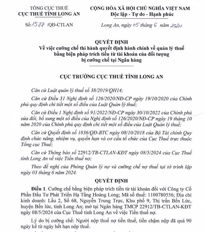 Cục Thuế tỉnh Long An vừa ban hành Quyết định số 1577/QĐ-CTLAN về việc cưỡng chế bằng biện pháp trích tiền từ tài khoản đối với Công ty Cổ phần Đầu tư Phát triển Hạ tầng Hoàng Long (gọi tắt là Công ty Hoàng Long), mã số thuế 1100780556, địa chỉ kinh doanh tại Lầu 2, Số 68, Nguyễn Trung Trực, Khu phố 9, thị trấn Bến Lức, huyện Bến lức, tỉnh Long An, mở tại Ngân hàng TMCP 22912/TB-CTLAN-KĐT ngày 08/5/2024 của Cục Thuế tỉnh Long An về việc tiền thuế nợ.