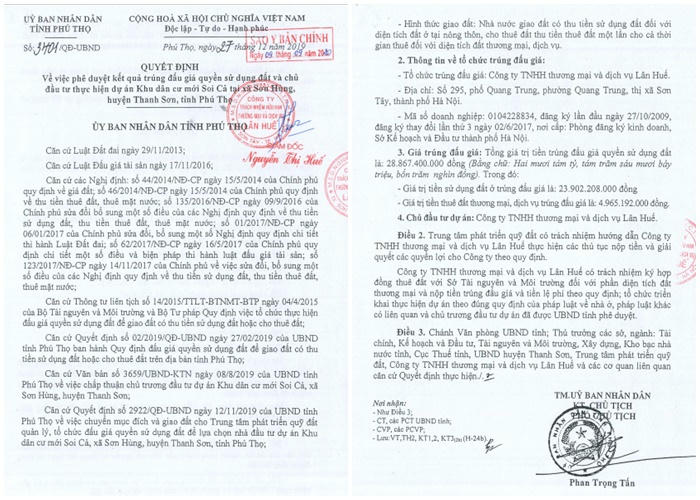 Được biết, dự án Thanh Sơn Riverside Garden do Công ty TNHH Thương mại và Dịch vụ Lân Huế (gọi tắt là Công ty Lân Huế) làm chủ đầu tư. Dự án được quảng cáo có quy mô 289.862,6m2, với tổng số 407 lô biệt thự, nhà ở liền kề. Theo tìm hiểu, khu đất rộng 289.862,6m2 thực hiện dự án Khu dân cư mới Soi Cả do Công ty Lân Huế trúng đấu giá với tổng số tiền hơn 28,8 tỷ đồng.