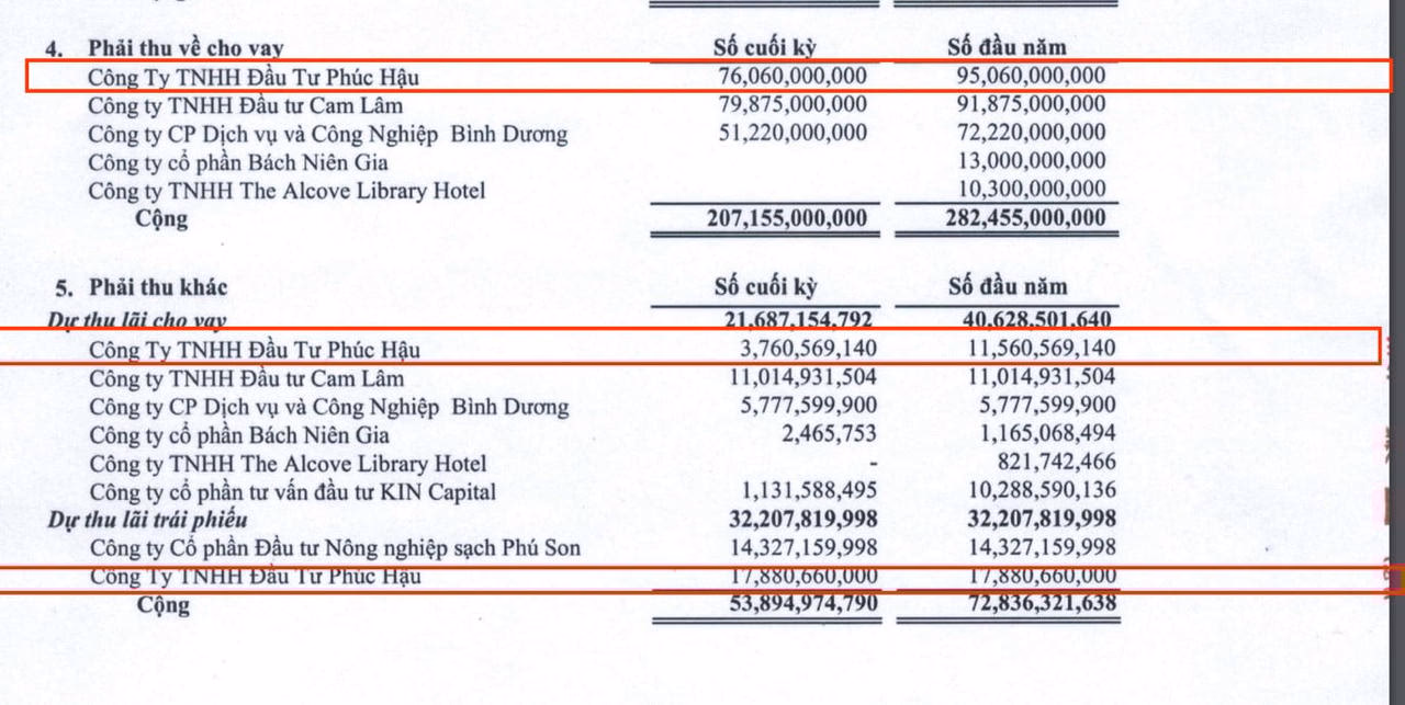 Theo sau là các khoản phải thu về cho vay với 207 tỷ đồng, chủ yếu nằm tại Công ty TNHH Đầu tư Cam Lâm (gần 80 tỷ đồng), Công ty TNHH Đầu tư Phúc Hậu (76 tỷ đồng), Công ty CP Dịch vụ và Công nghiệp Bình Dương (51 tỷ đồng).