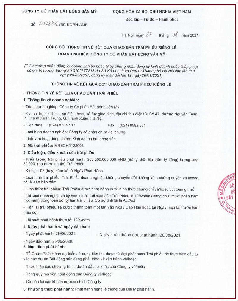 Theo thông tin từ Sở giao dịch Chứng khoán Hà Nội (HNX), Công ty Cổ phần BĐS Mỹ (doanh nghiệp liên quan đến TNG Holdings) vừa công bố đã phát hành thành công 300 tỷ đồng trái phiếu.