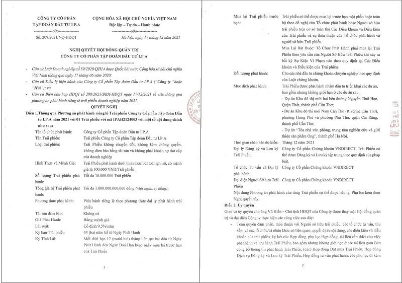 Trước đó IPA đã công bố thông tin về việc chào bán 10.000.000 trái phiếu riêng lẻ, mã trái phiếu là IPAH2124003. Theo đó, mục đích của đợt phát hành trái phiếu nhằm để đầu tư ba dự án gồm: Khu đô thị mới hai bên đường Nguyễn Thái Học (quận Thốt Nốt, TP Cần Thơ), Khu đô thị mới Nam Cần Thơ (Riverine Cần Thơ) và Tòa nhà văn phòng, trung tâm nghiên cứu và giới thiệu sản phẩm Ong (Hà Nội).