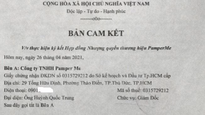 Hợp đồng có thời hạn trong 3 năm (từ ngày 26/4/2021 đến ngày 2/12/2024), thực hiện tại Cửa hàng nhượng quyền thương hiệu Pamper Me quận 12, với tổng giá trị là 678 triệu đồng. Theo đó, Công ty Pamper Me chuyển giao thương hiệu Pamper Me và các quy trình kỹ thuật phục vụ khách hàng, từ khâu tuyển dụng, đào tạo nhân viên đến kỹ năng bơi thủy liệu cho bà Trang. Về tiến độ thanh toán, năm thứ nhất trả 408 triệu đồng, 2 năm sau đó, mỗi năm thanh toán 108 triệu đồng. Phương thức thanh toán bằng trả tiền mặt hoặc chuyển khoản và trong 7 ngày sau khi nhận đủ tiền, Công ty Pamper Me phải xuất hóa đơn giá trị gia tăng (GTGT) cho bà Trang.