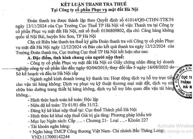 Cục Thuế Tp.Hà Nội vừa công bố kết luận thanh tra đối với Công ty Cổ phần Phục vụ Mặt đất Hà Nội, có trụ sở tại Cảng hàng không quốc tế Nội Bài, huyện Sóc Sơn.