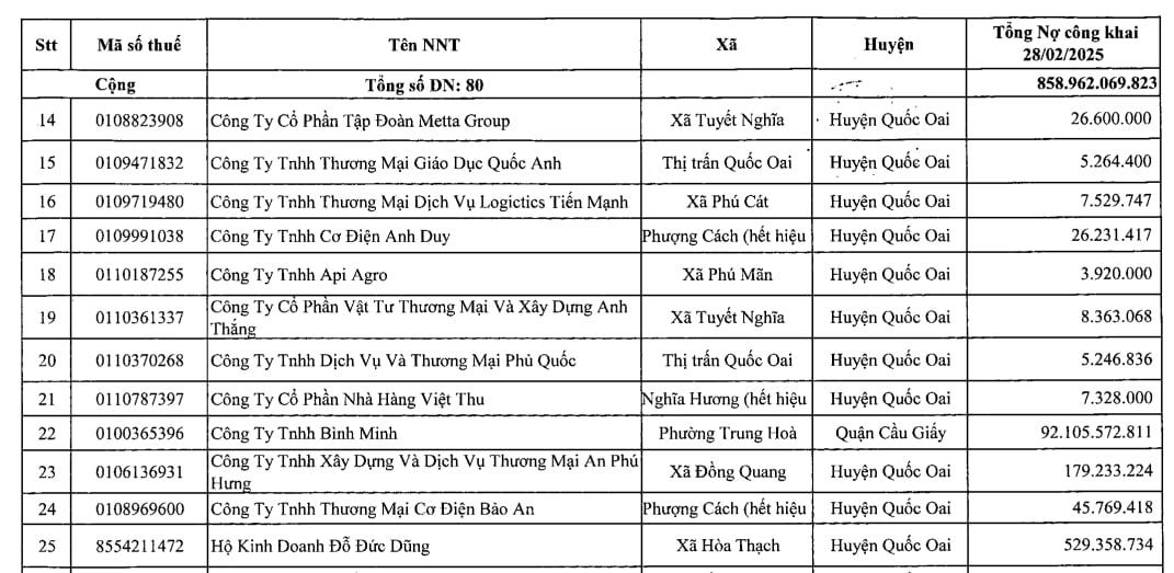 Đội thuế Liên huyện Thạch Thất – Quốc Oai, Chi Cục thuế Khu vực I vừa thông báo công khai danh sách 80 người nộp thuế nợ tiền thuế và các khoản thu khác thuộc ngân sách nhà nước (thời điểm khóa sổ 28/2/2025). Theo đó, tổng số tiền nợ tiền thuế và các khoản thu khác thuộc ngân sách nhà nước đến thời điểm này là hơn 858,96 tỷ đồng.