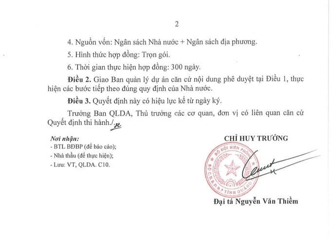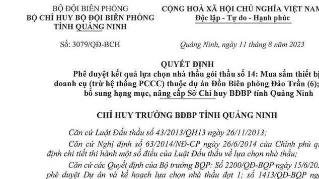 Cụ thể: Tại Quyết định số 2894/QĐ-BCH ngày 28/07/2023, Bộ chỉ huy Bộ đội Biên phòng tỉnh Quảng Ninh đã phê duyệt kết quả lựa chọn nhà thầu Gói thầu số 12: Thi công xây dựng, cải tạo các hạng mục: Nhà khách và đối ngoại; Nhà ở cán bộ, chiến sỹ; Hạ tầng kỹ thuật tại Trụ sở BĐBP tỉnh (trừ chống mối) thuộc dự án: Đồn Biên phòng Đảo Trần; bổ sung hạng mục, nâng cấp Trụ sở Bộ đội Biên phòng tỉnh Quảng Ninh cho Công ty Cổ phần Đầu tư Xây dựng và Thương mại Tân An Đại Thịnh trúng thầu với giá 33.920.169.000 đồng, giá trúng thầu 33.939.001.000 đồng, tiết kiệm ngân sách 18.832.000 đồng, chiếm tỉ lệ 0,05%.