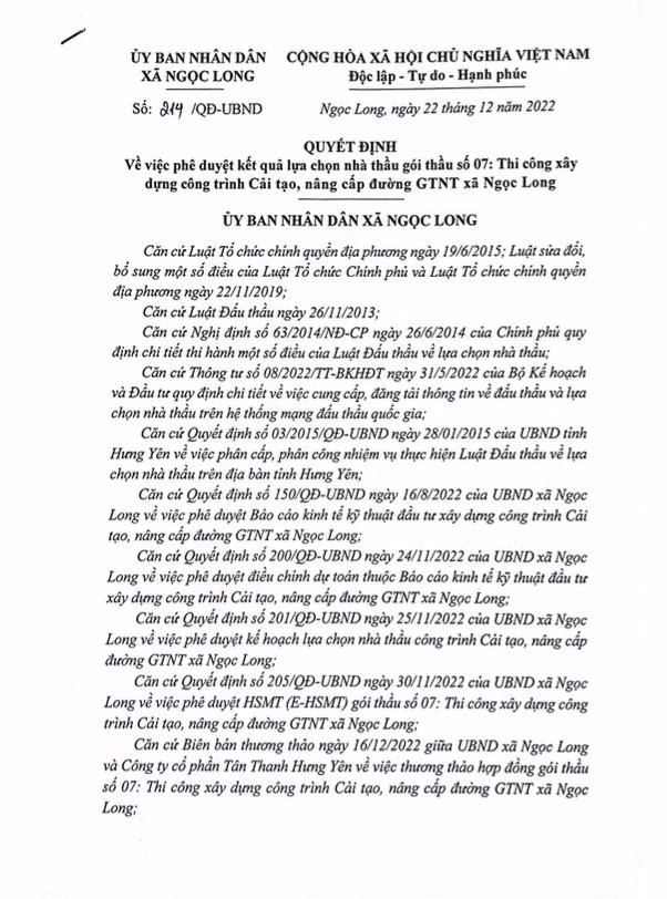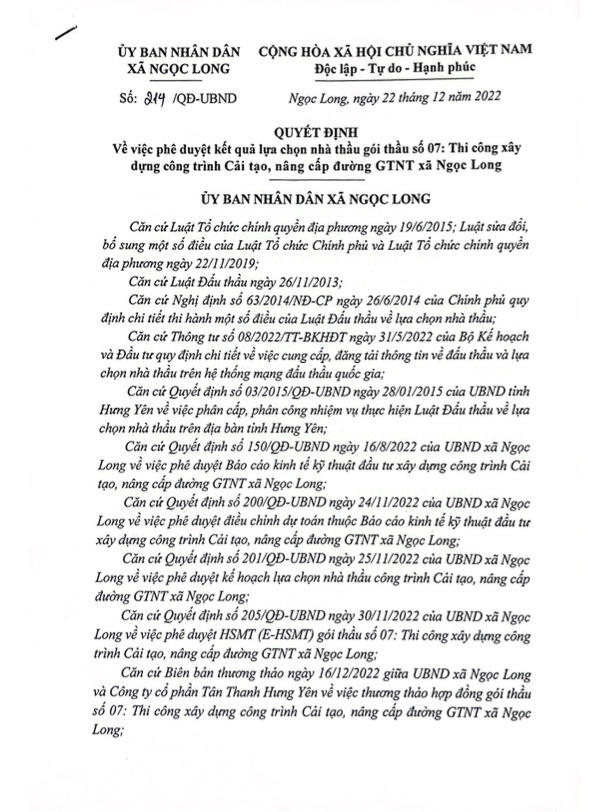 Tại Số 214/QĐ-UBND ngày 22/12/2022, Ủy ban nhân dân xã Ngọc Long đã phê duyệt gói thầu số 07: Thi công xây dựng công trình thuộc dự án Cải tạo, nâng cấp đường GTNT xã Ngọc Long cho Công ty Cổ phần Tân Thanh Hưng Yên trúng thầu với giá 11.440.308.268 đồng, giá gói thầu 11.447.208.000 đồng, tiết kiệm ngân sách gần 7 triệu đồng, chiếm tỉ lệ 0,06%.