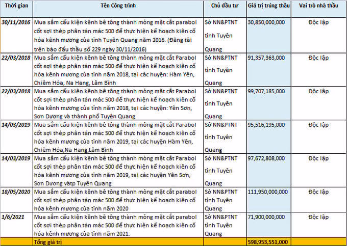 Công ty Thành Hưng trúng tất cả các gói thầu đều có chung một nội dung: “Mua sắm cấu kiện kênh bê tông thành mỏng mặt cắt parabol cốt sợi thép phân tán mác 500 để thực hiện kế hoạch kiên cố hóa kênh mương” xuyên suốt từ năm 2016 đến 2021.
