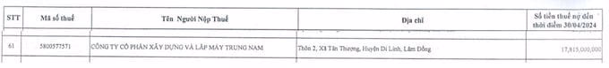 Dẫn đầu về số nợ trong danh sách này là Công ty Cổ phần Xây dựng và Lắp máy Trung Nam (Trungnam E&C, có địa chỉ tại huyện Di Linh, tỉnh Lâm Đồng) với số nợ thuế trên 17,8 tỷ đồng.