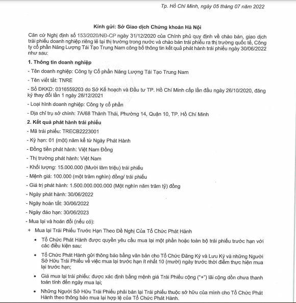 Mới đây nhất, theo tin từ Sở giao dịch Chứng khoán Hà Nội (HNX), CTCP Năng lượng tái tạo Trung Nam – thành viên của Trungnam Group vừa huy động thành công 1.500 tỷ đồng trái phiếu.