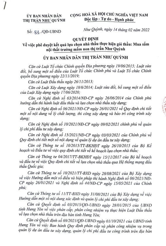 Tại Quyết định số 81/QĐ-UBND ngày 14/2/2022, ông Lê Thế Am – Chủ tịch UBND thị trấn Như Quỳnh đã phê duyệt kết quả lựa chọn nhà thầu gói thầu: Mua sắm nội thất trường mầm non thị trấn Như Quỳnh cho Công ty TNHH nội thất Tiến Bộ trúng thầu với giá 2.726.264.530 đồng, giá dự toán 2.915.134.000 đồng.
