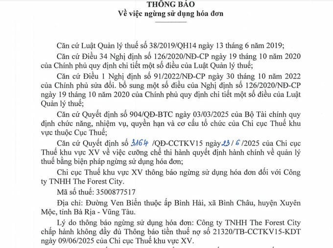 Cụ thể, Công ty TNHH The Rorest City, mã số thuế: 3500877517, có địa chỉ: Đường Ven Biển thuộc ấp Bình Hải, xã Bình Châu, huyện Xuyên Mộc, tỉnh Bà Rịa - Vũng Tàu, bị cưỡng chế thuế ngừng sử dụng hóa đơn do công ty có tiền thuế nợ quá 90 ngày kể từ ngày hết thời hạn nộp theo quy định, với tổng số tiền 130.519.662.100 đồng (hơn 130 tỷ đồng).
