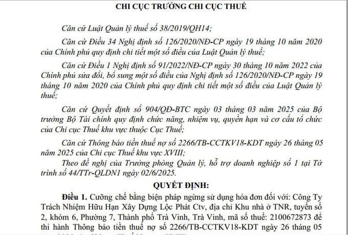 Chi cục Thuế khu vực XVIII (Trà Vinh) đã ban hành quyết định cưỡng chế thuế đối với Công ty TNHH Xây dựng Lộc Phát CTV.
