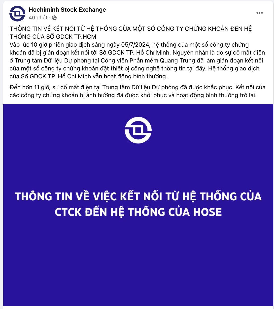 Sự việc xảy ra vào khoảng 10 giờ trong phiên giao dịch sáng. Ngay đến đầu phiên chiều, HoSE đã phát đi thông báo để thông tin về sự cố này. Theo đó, phía HoSE cho biết nguyên nhân của việc gián đoạn kết nối do sự cố mất điện tại Trung tâm Dữ liệu Dự phòng tại Công viên Phần mềm Quang Trung (QTSC) đã làm gián đoạn kết nối của một số công ty chứng khoán đặt thiết bị công nghệ thông tin tại đây.