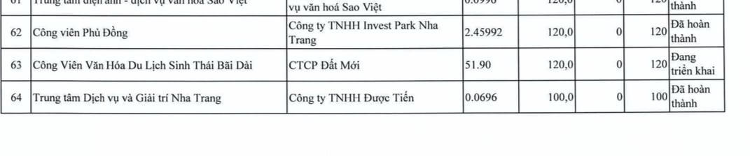 Trong danh sách này có đề cập tới dự án Công viên văn hóa Yến sào Khánh Hòa, chủ đầu tư là Công ty TNHH Nhà nước MTV Yến sào Khánh Hòa. Dự án có quy mô 1,7ha, tổng vốn đầu tư 197 tỷ đồng. Tiến độ dự án theo cập nhật là đang triển khai.