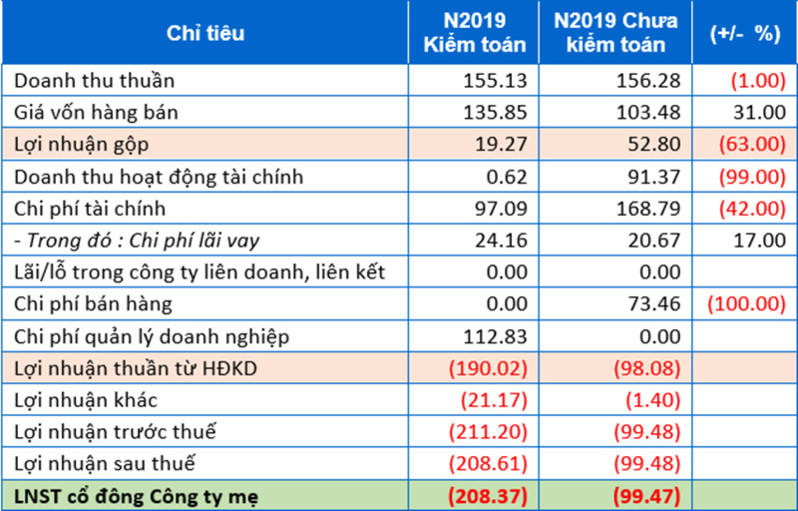 Công ty mẹ ghi nhận doanh thu sau kiểm toán 149,5 tỷ đồng, giảm 3%; lợi nhuận sau thuế âm 198 tỷ đồng, giảm 56% so với trước kiểm toán.