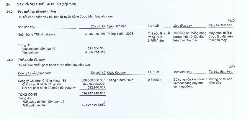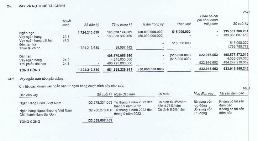 Trong đó, nợ vay ghi nhận gần 634 tỷ đồng với 494 tỷ đồng là nợ vay dài hạn (chủ yếu là trái phiếu) và còn khoảng 135 tỷ là vay ngắn hạn ngân hàng.