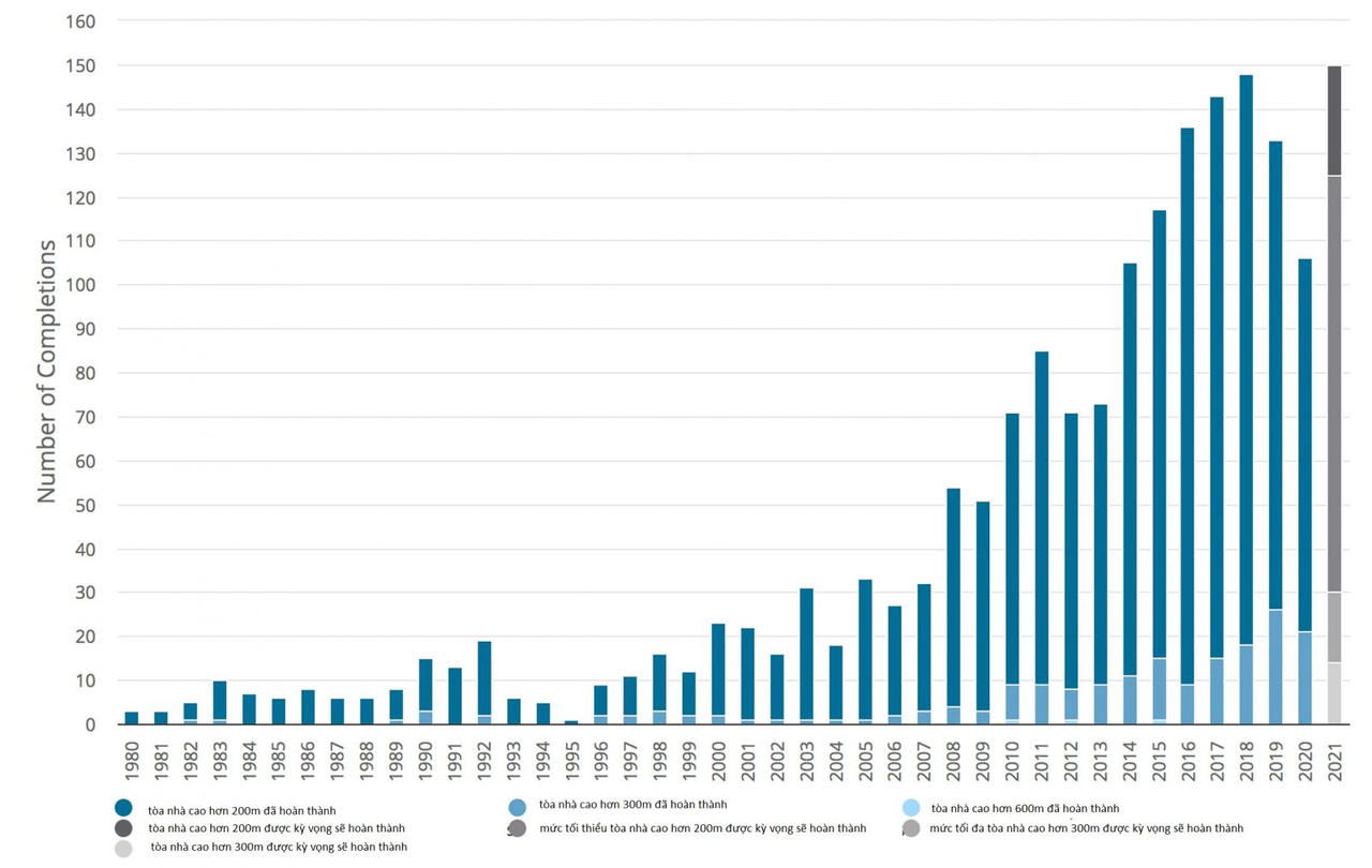 Trong năm qua, 106 tòa nhà có chiều cao hơn 200m đã hoàn thành, giảm mạnh so với con số 133 của năm 2019. Đây là con số thấp nhất kể từ năm 2014 (khi 105 tòa cao ốc được hoàn thành).