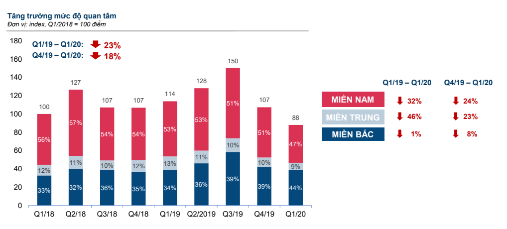 Báo cáo của batdongsan.com.vn cũng cho biết, số lượng dự án chung cư mới đăng tin rao bán trong quý I/2020 thấp nhất trong vòng 3 năm qua, giảm xuống còn 59 dự án. Lượng quan tâm giảm ở các phân khúc.