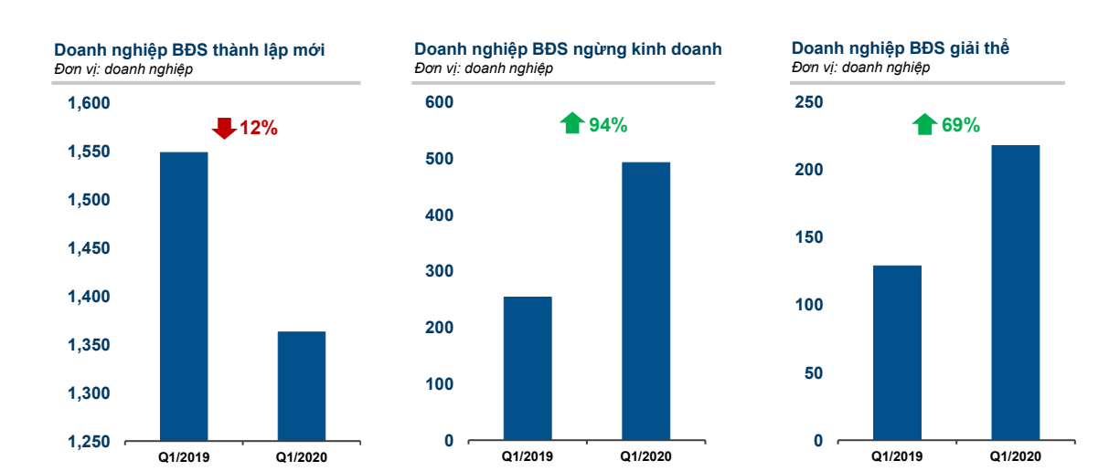 Theo Tổng cục Thống kê, trong quý I/2020, số doanh nghiệp bất động sản thành lập mới giảm 12%, trong khi số doanh nghiệp tạm ngừng kinh doanh tăng 94% và doanh nghiệp giải thể tăng 69%.