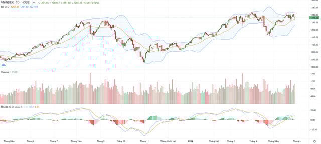 Xu hướng trung hạn của vẫn duy trì tích lũy trong kênh giá 1.250-1.300 điểm sau nhịp giảm điểm mạnh. Nếu giữ được vùng hỗ trợ 1.250 điểm VN-Index vẫn có thể duy trì kỳ vọng phục hồi trở lại hướng tới vùng 1.282-1.287 điểm, tương ứng vùng giá cao nhất phiên giảm điểm mạnh 15/4/2024 cũng như đỉnh giá tháng 09/2022.
