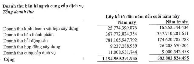 Tương tự, trong năm tài chính 2024, doanh thu lĩnh vực xây dựng chỉ hơn 9,2 tỷ đồng, doanh thu bất động sản chiếm phần lớn trong cơ cấu doanh thu khi đạt 781,2 tỷ đồng, chiếm tới 65,4% tổng doanh thu.