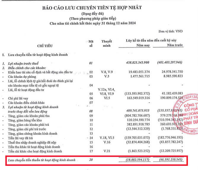 Dù có lãi trở lại nhưng về dòng tiền, trong năm 2024, Kinh doanh và Phát triển Bình Dương tiếp tục duy trì mô hình thâm hụt dòng tiền khi âm thêm 18,88 tỷ đồng so với cùng kỳ âm 46,59 tỷ đồng. Ngoài ra, cũng trong kỳ, dòng tiền đầu tư dương 15,6 tỷ đồng và dòng tiền tài chính dương 3,7 tỷ đồng.