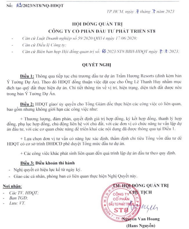 CTCP Siêu Thanh trước đây được biết đến là đơn vị chuyên kinh doanh mặt hàng ô tô, máy photocopy đến nay đã được đổi tên thành CTCP Đầu tư và Phát triển ST8 (ST8) với ngành nghề bất động sản. Dự án đầu tay mà ST8 dự kiến sẽ thực hiện là dự án Trầm Hương Resorts, theo đó, HĐQT công ty này đã đồng thuận về việc đặt cọc cho ông Lê Thanh Huy nhằm mục đích tạo quỹ đất thực hiện dự án.