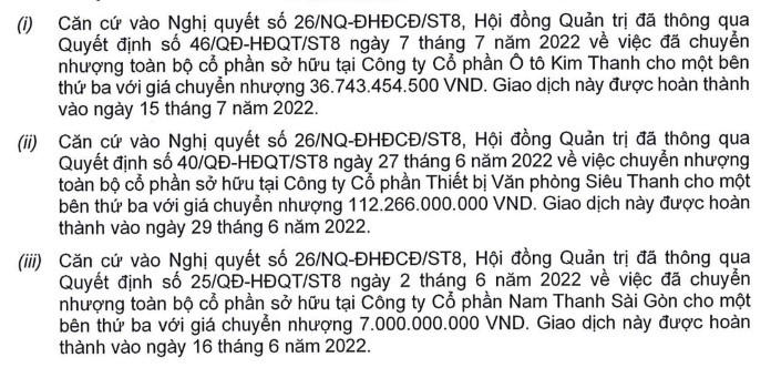 Trong đó, giao dịch lớn nhất là việc bán hết cổ phần tại CTCP Ô tô Kim Thanh, đại lý chính thức của ô tô Honda từ năm 2006, cho một bên thứ ba. Giao dịch này đã hoàn tất vào 15/07/2022 với giá trị hơn 36,7 tỷ đồng.