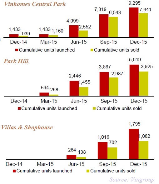 Trong đó, dự án Vinhomes Central Park tại Tp.HCM có số lượng nhà ở bán được cao nhất với 7.641 căn được bán trong năm 2015 đạt 82% tổng số căn hộ tung ra thị trường. Ngoài ra, Vingroup cũng đã bán được tới gần 4.000 căn hộ tại dự án Park Hill (Hà Nội) và khoảng hơn 1000 biệt thự và shophouse ở tất cả các thị trường.