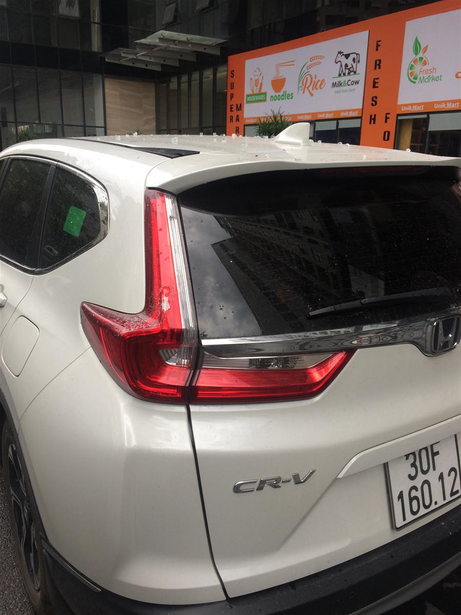 Sự cố rơi tấm kính của tòa nhà đã khiến phần đèn hậu chiếc xe CRV đậu gần đó bị nứt vỡ. Rất may không ảnh hưởng gì tới người dân đi lại khu vực đó.