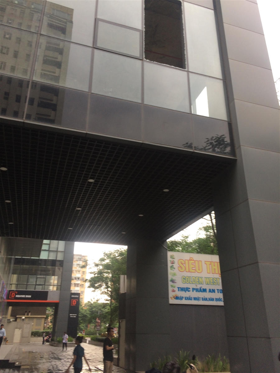 Tấm kính lớn thuộc phần khối đế của tòa nhà Golden west bất ngờ rơi vỡ thành nhiều mảnh tại lối đi của cư dân vào chiều 29/8 khiến nhiều người hết sức hoảng loạn.