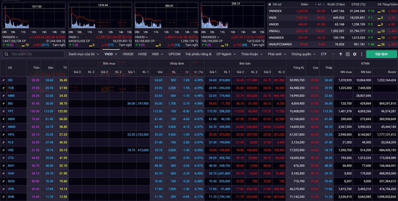 Kết thúc phiên giao dịch sáng ngày 3/4/2025, VN-Index đóng cửa ở mức 1.235,55 điểm, giảm 82,28 điểm so với tham chiếu, tương đương 6,24%, tiệm cận mức giảm tối đa. Thanh khoản cao kỷ lục, vượt ngưỡng 31.200 tỷ đồng.