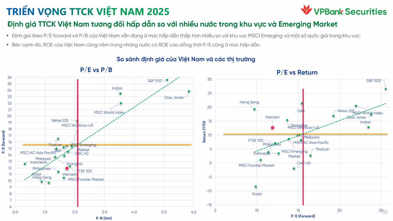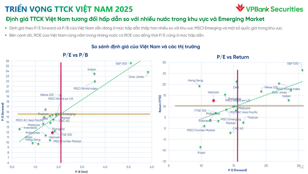 Chưa kể, định giá thị trường Việt Nam cũng tương đối hấp dẫn so với nhiều nước trong khu vực và thị trường mới nổi. P/E của chỉ số VN-Index đang ở mức gần 14,9 lần, thấp hơn trung vị 10 năm gần đây.