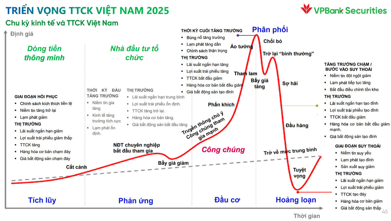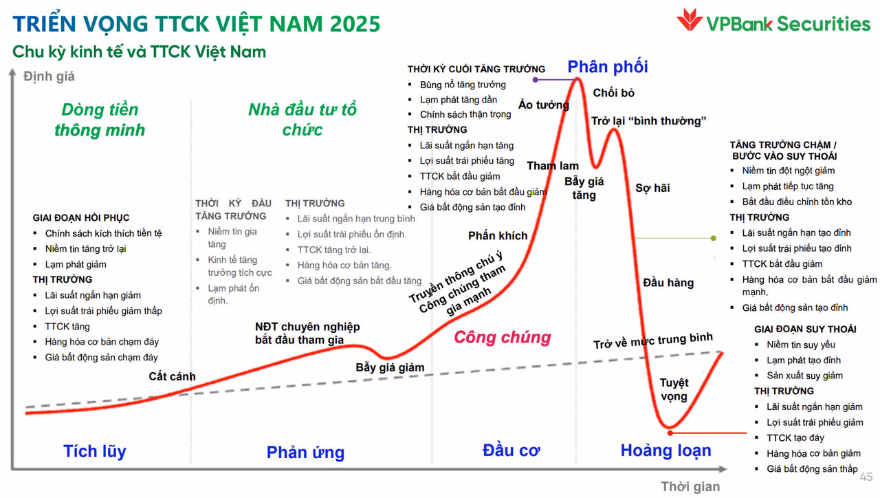 Phân tích rõ hơn, ông Trần Hoàng Sơn – Giám đốc Giám đốc Chiến lược thị trường Chứng khoán VPBank cho hay, trong chu kỳ tăng trưởng, thị trường chứng khoán Việt Nam hiện đang ở giai đoạn “phản ứng”: đang phục hồi dần từ đáy và đối mặt với các “bẫy giảm giá”.