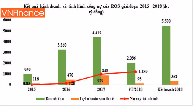 Giai đoạn 2015 – 2017, ROS ghi nhận tăng trưởng cả về doanh thu và lợi nhuận. Tuy nhiên năm 2018 có lẽ là một năm “đen tối” của doanh nghiệp khi hết 9 tháng đầu năm ROS mới chỉ hoàn thành được 37% kế hoạch doanh thu và 26% kế hoạch lợi nhuận năm.