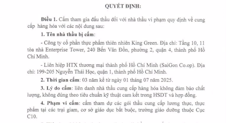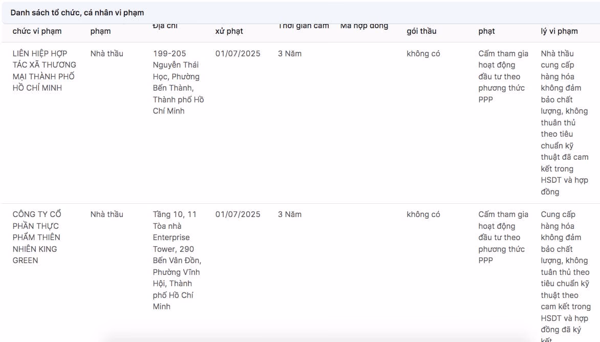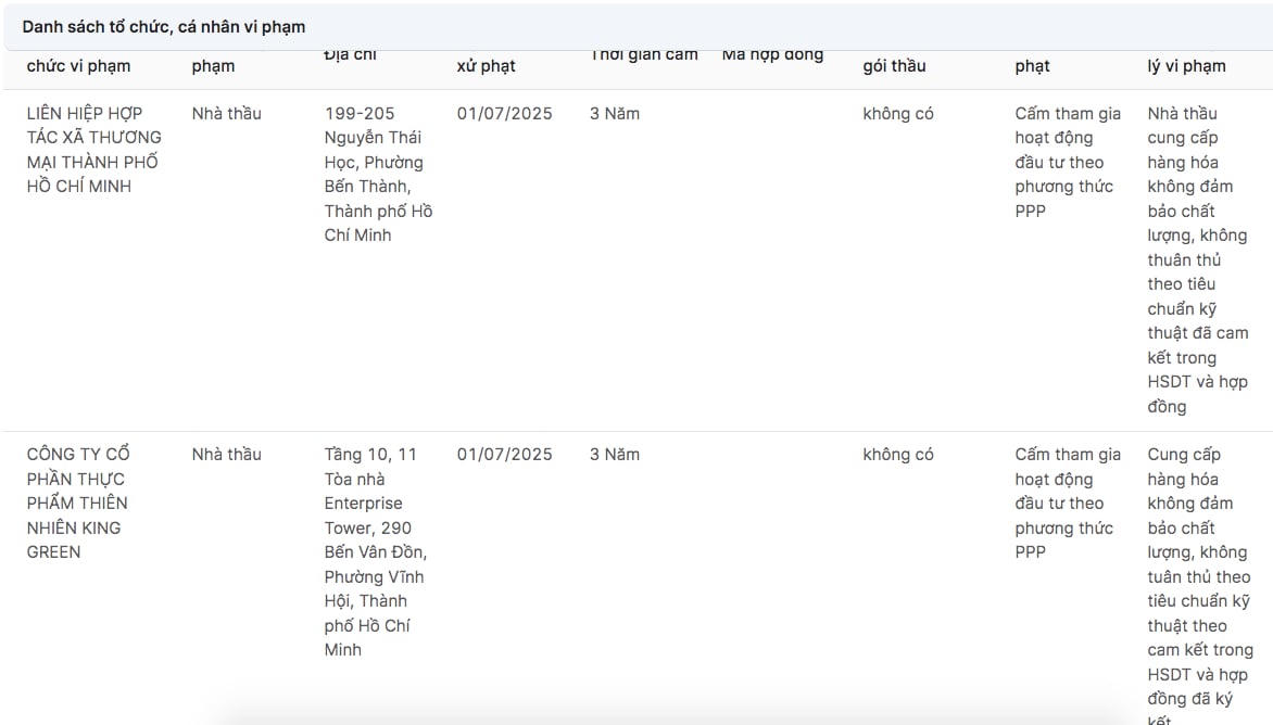 Nhà thầu bị cấm thầu gồm: Công ty cổ phần Thực phẩm thiên nhiên King Green, địa chỉ toà nhà Enterprise, 240 bến Vân Đồn, phường 2, quận 4, TP. HCM; và Liên minh Hợp tác xã Thương mại TP. HCM (SaiGon Co.op), địa chỉ 199-205 Nguyễn Thái Học, quận 1, TP. HCM.