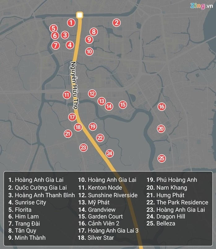 Một số dự án nổi bật trên trục đường này bao gồm Sunrise City và Sunrise Riverside của Tập đoàn Novaland, Hưng Phát Silver Star của Hưng Lộc Phát, Dragon City của Phú Long, Celesta Rise và Celesta Heights từ Keppel Land và Phú Long. Hiện tại, giá bán các căn hộ dọc tuyến đường này dao động từ 40 - 100 triệu đồng/m2, tùy thuộc vào vị trí và dự án.
