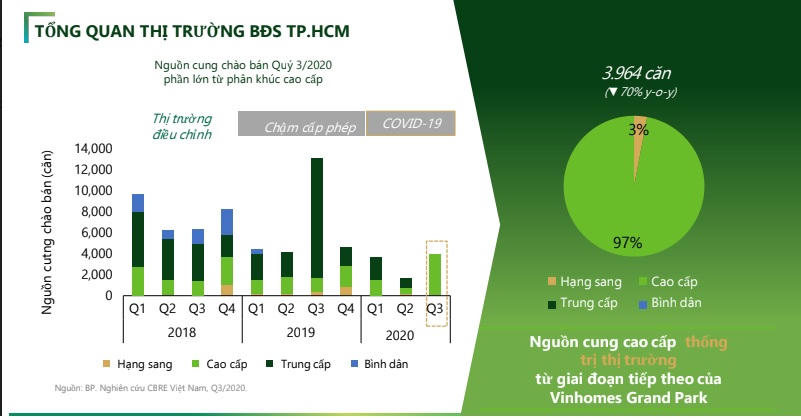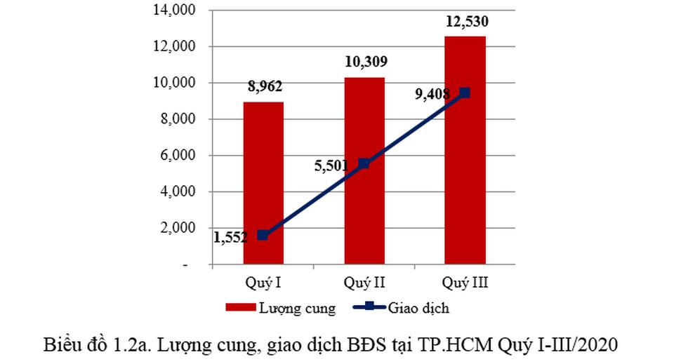 Số liệu thống kê của Hội môi giới cho thấy trong 9 tháng đầu năm 2020, tại TPHCM có 14.286 căn hộ chung cư mới được chào bán ra thị trường (riêng quý 3/2020 có 7.197 căn hộ chào mới, giao dịch 5.406 căn hộ). Nguồn cung mới có sự tụt giảm mạnh mẽ so với hai năm trước đó, chỉ bằng 80% so với năm 2018 và bằng 70% so với năm 2019.