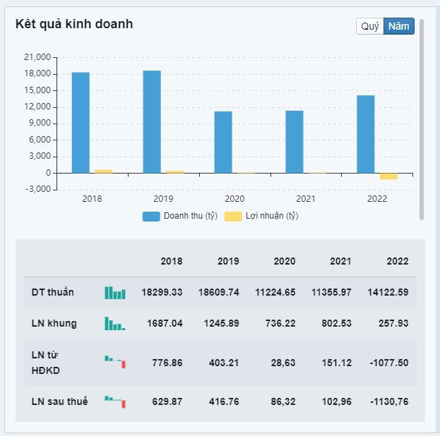 Đến quý I/2023, tình hình vẫn chưa có dấu hiệu khá khẩm hơn với 1.194 tỷ doanh thu thuần, giảm 60% so với cùng kỳ và lỗ sau thuế gần 445 tỷ đồng.
