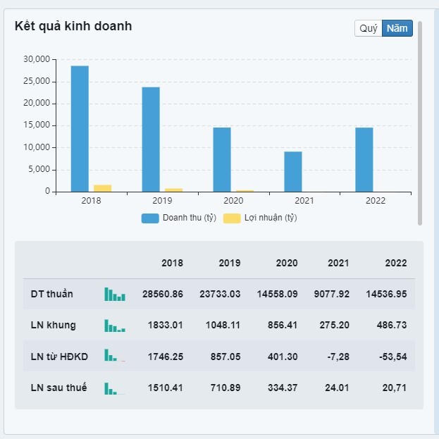 Các năm tiếp theo, báo cáo tài chính của công ty tiếp tục công bố thông tin với những bước trượt dài của doanh nghiệp, năm 2020 lãi 334 tỷ đồng, năm 2021 lãi 24 tỷ đồng và tới năm 2022 xuống mức “đáy” 20,7 tỷ đồng.