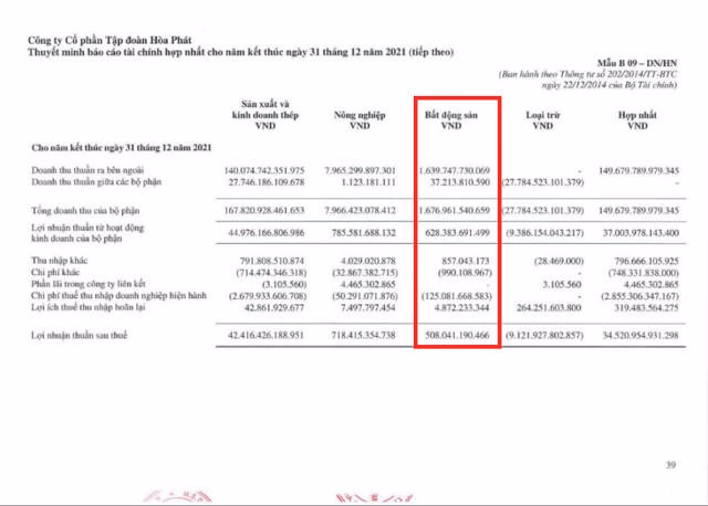 Năm 2020, lợi nhuận sau thế mảng bất động sản của Hòa Phát đạt 401 tỷ đồng, chiếm tỷ trọng gần 3% trong tổng lợi nhuận sau thuế. Theo báo cáo tài chính hợp nhất cho năm kết thúc ngày 31/12/2021, lợi nhuận thuần sau thuể mảng BĐS đạt hơn 508 tỷ, đóng góp 1,42%.