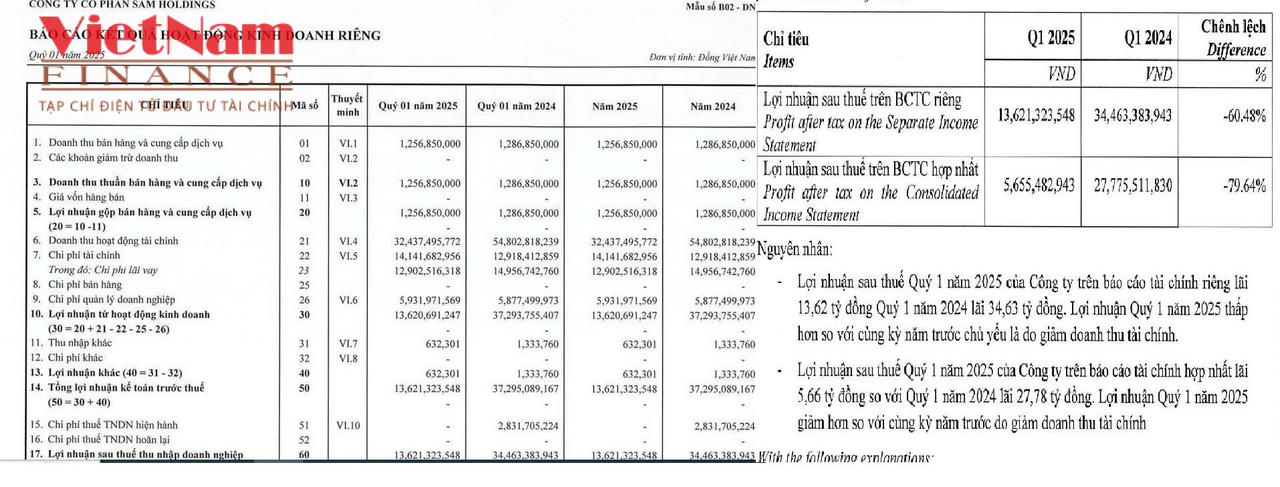 Theo báo cáo tài chính riêng quý I/2025 của Công ty Cổ phần SAM Holdings (mã: SAM), doanh thu thuần chỉ đạt 1,2 tỷ đồng, gần như không thay đổi so với cùng kỳ và đang ở mức rất thấp so với quy mô tài sản gần 5.000 tỷ đồng. Dù vậy, công ty vẫn báo lãi sau thuế 13,6 tỷ đồng, so với 34,1 tỷ cùng kỳ năm 2024.