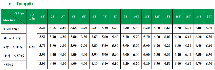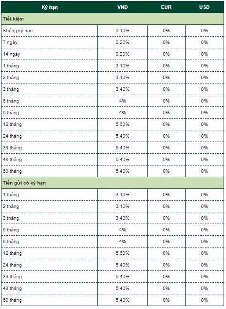 Cụ thể, với các kỳ hạn dài từ 24 tháng – 60 tháng, lãi suất tiền gửi tăng 0,1 điểm % từ 5,3%/năm lên 5,4%/năm. Tương tự với kỳ hạn ngắn hơn như 3 tháng, lãi suất cũng tăng 0,1 điểm % từ 3,3%/năm lên 3,4%/năm. Đối với các kỳ hạn 1 tháng, 2 tháng và 12 tháng, Vietcombank điều chỉnh tăng lãi suất thêm 0,2 điểm %.