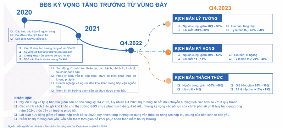 Đồng thời, ông Khôi cũng dự báo, thời điểm quý IV/2023 thị trường bất động sản sẽ ấm dần lên. Dat Xanh Services đưa ra ba kịch bản cho thị trường bất động sản quý IV/2023: Kịch bản lý tưởng: Nguồn cung giảm 20-30%; lãi suất dưới 10-12%, giá bán tăng nhẹ, tỷ lệ hấp thụ 40-50%; Kịch bản kỳ vọng: Nguồn cung giảm 30-50%; Giá bán đi ngang, lãi suất 11-13%, tỷ lệ hấp thụ 20%; Kịch bản thách thức: Nguồn cung giảm trên 50-60%; giá bán giảm 20%; lãi suất trên 14% tỷ lệ hấp thụ 10%.