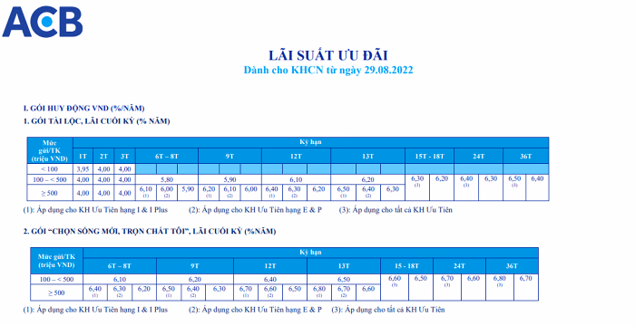 Vài tháng trở lại đây, ngân hàng ACB là một trong những nhà băng thay đổi biểu lãi suất tiết kiệm nhiều nhất. Đầu tháng 8, ACB đã cộng thêm lãi suất ở nhiều kỳ hạn, mức điều chỉnh khá mạnh từ 0,1-0,6%/năm. Mới đây, kể từ ngày 29/8, ngân hàng ACB tiếp tục điều chỉnh tăng biểu lãi suất huy động thêm 0,1 điểm % tại một số kỳ hạn.