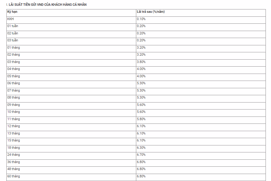 Cụ thể, với các kỳ hạn từ 7-8 tháng, lãi suất tiền gửi tăng 0,3 điểm % từ 5%/năm lên 5,3%/năm. Tại kỳ hạn dài hơn như 36 tháng, lãi suất tiền gửi tăng 0,2 điểm % lên 6,8%/năm. Với kỳ hạn 48 tháng và 60 tháng, ngân hàng tăng đến 0,4 điểm % lãi suất lên 6,8%/năm.