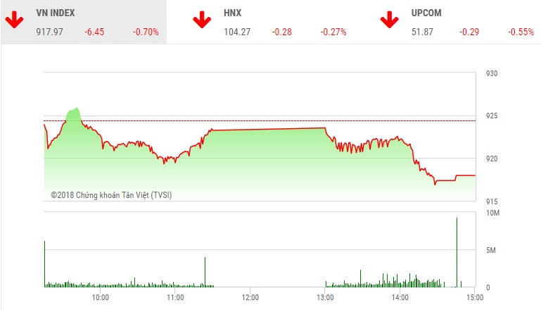 Kết thúc phiên giao dịch ngày 23.11, VnIndex giảm 6,45 điểm (0,7%) xuống 917,97 điểm. (Ảnh: TVSI)
