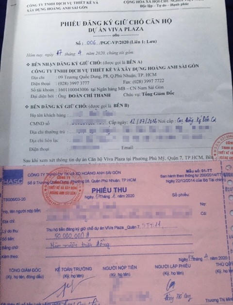 Từ đây, ông Đoàn Chí Thanh đã ký kết nhiều phiếu đăng ký giữ chỗ căn hộ dự án Viva Plaza và thu 50 triệu đồng mỗi phiếu đăng ký giữ chỗ của khách hàng.